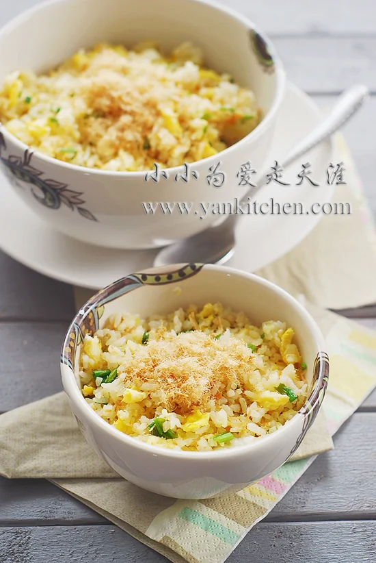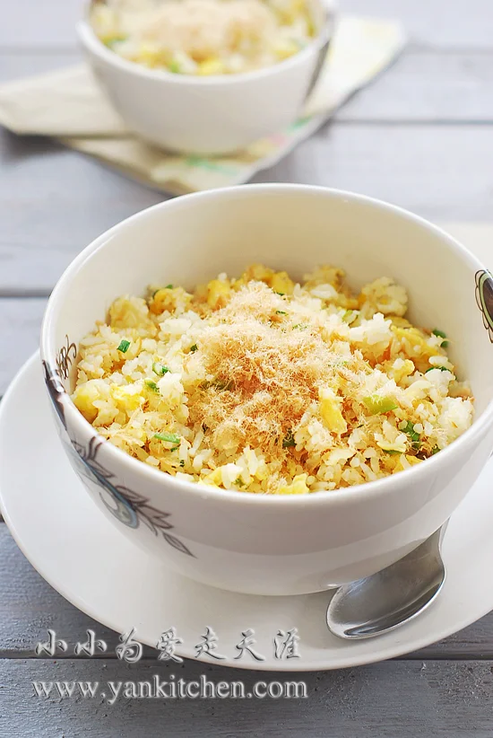 肉松葱香蛋炒饭 Yan April 23, 2013 突然很想吃蛋炒饭,正好冰箱里有隔夜的米饭,用来做炒饭最合适不过了。 原料:1大碗米饭3个大号鸡蛋1/2杯肉松6到8根葱盐和菜油适量 做法: 米饭用筷子或者叉子轻轻打散,不然,成团的米饭下锅后不好炒。 鸡蛋打散成蛋液,葱洗净切成葱花。 将铁锅用中高火烧热,下油,随即下蛋液,等蛋液略微凝固的时候,下米饭,迅速的翻炒,争取让每粒米饭都裹上蛋液,然后加盐调味,下葱花一起翻炒,等到葱花断生,撒入肉松,翻炒均匀,便可出锅装盘。 蛋炒饭本身就已经很香了,加入了肉松,多了一层香味和滋味,非常好吃。