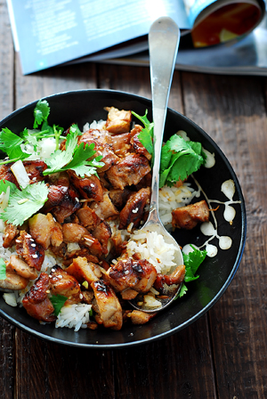 煎好的鸡肉趁热切块,铺在白米饭面上,浇上一点锅里的汤汁,撒上芝麻,香菜和洋葱碎,开吃!