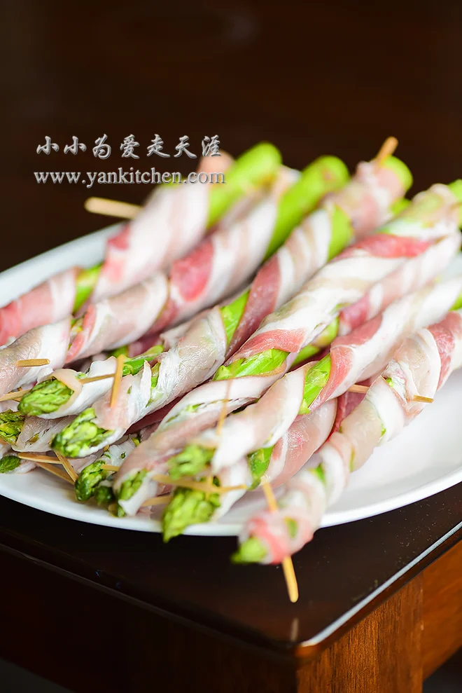 每一根芦笋都用培根缠绕好,两端用牙签固定住