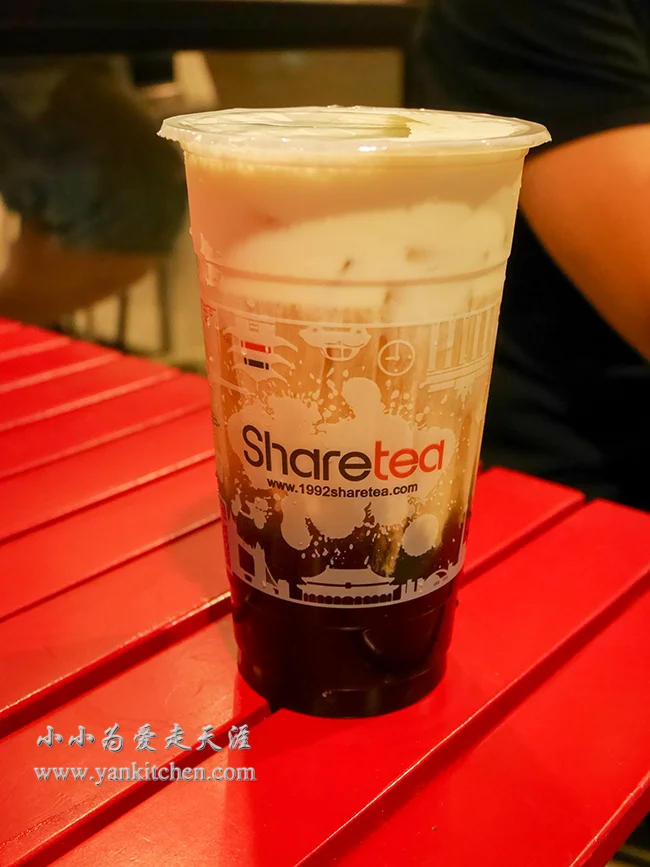 他家与国内的潮流与时共进,也出国内流行的奶盖茶了。我要了一杯奶盖绿茶,加了珍珠,老公点了杯香芋红豆奶茶。