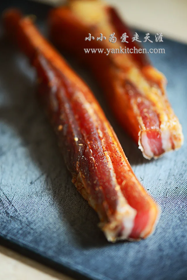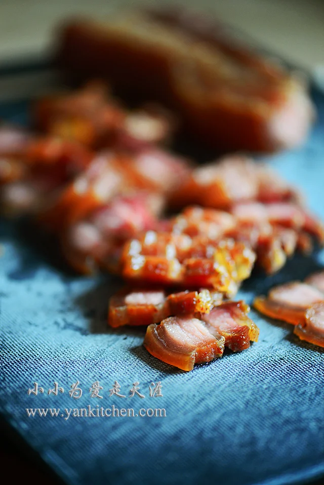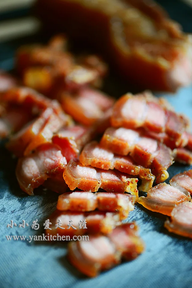将腊肉上蒸笼蒸20分钟后,取出来,切片。