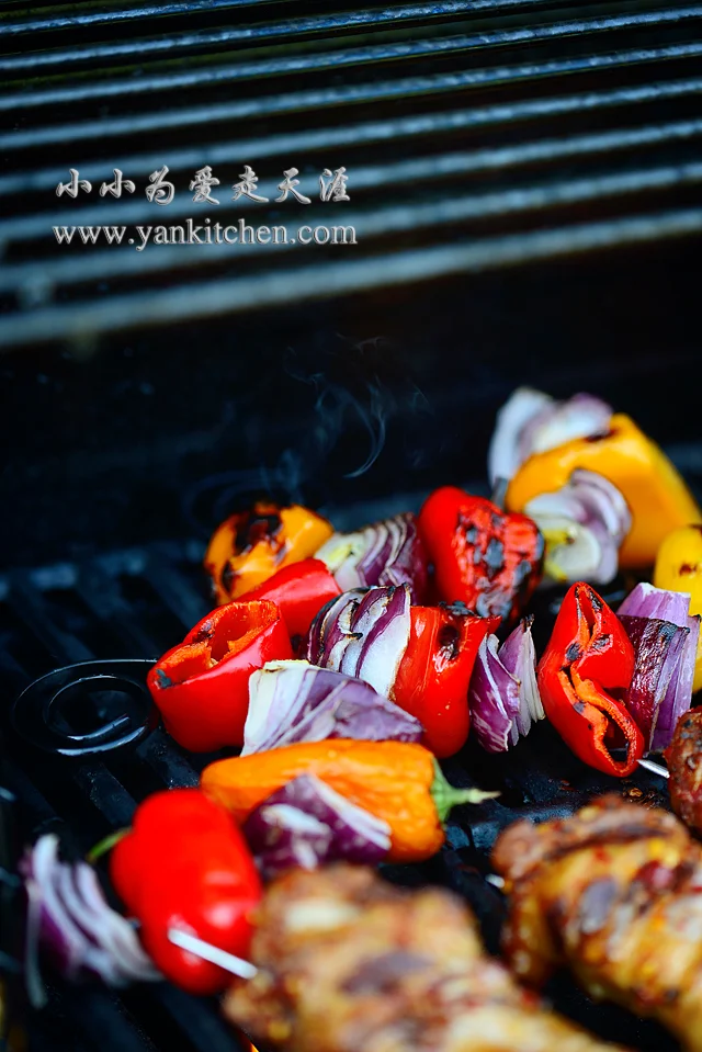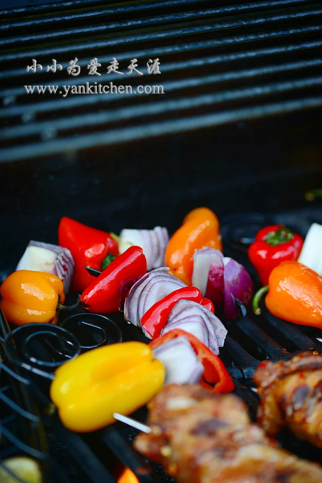BBQ烤小彩椒 Yan June 23, 2014 推荐使用 这种小小的个头的彩椒,很适合烧烤,汁水少,烤了以后变软,很清甜,非常好吃。 原料: 1盒小彩椒1个紫色洋葱现磨的黑胡椒碎盐油 做法: 小彩椒洗净,大个的切成两段,紫色洋葱去皮,切大块,用铁钎子串好。 在蔬菜串的表面喷点油,撒上盐和胡椒,放到烤架上烤到辣椒变软,洋葱断生为止。
