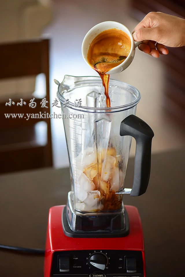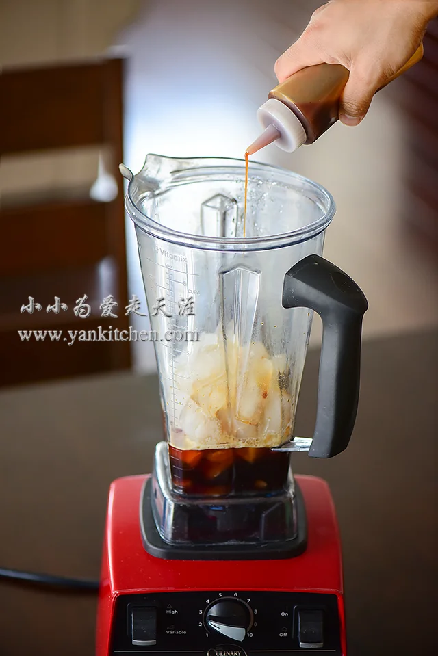 把打好的咖啡,冰块,焦糖糖浆和牛奶一起放到vitamix 里面。