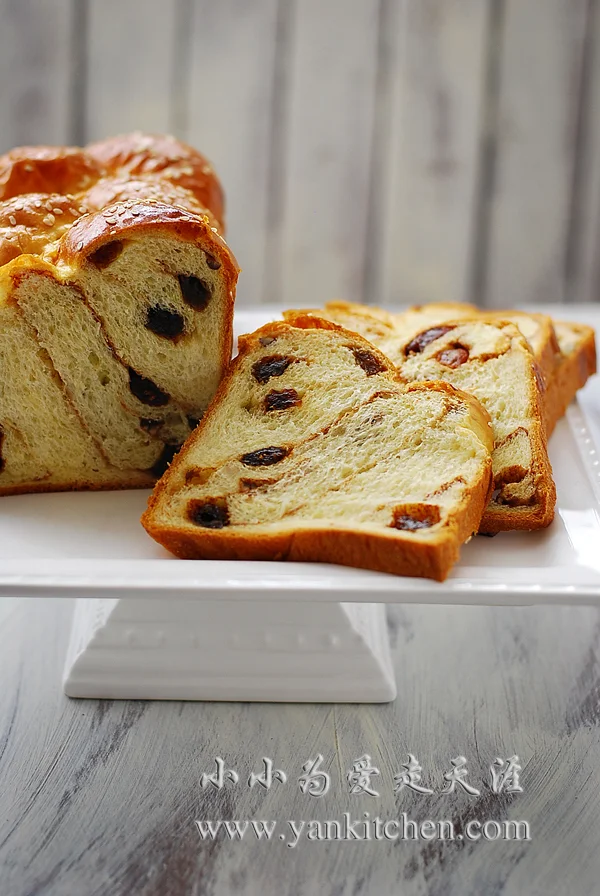 将面团取出来,压扁排气,轻轻的揉圆,盖好,醒发10分钟。 然后,将面团分成3等份,分别将每一份擀薄,薄薄的抹上一层黄油,撒上红糖,肉桂粉,葡萄干和山核桃碎,卷起成面卷,然后将3条面卷编成辫子,放入吐司模子内,盖好,再次发酵至面团2倍大的时候,表面刷蛋液,撒上白芝麻,送入预热至350F/161度的烤箱,烤30至35分钟。