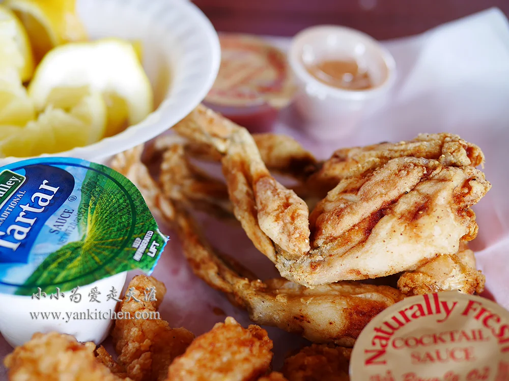 点了1磅jumbo的大虾,1磅大带子scallops,还有1/2磅蛙腿。这里几乎每一桌上都有一条炸的red snapper,本来我想点,一看每一条都硕大无比,都在五六磅左右,只好放弃。