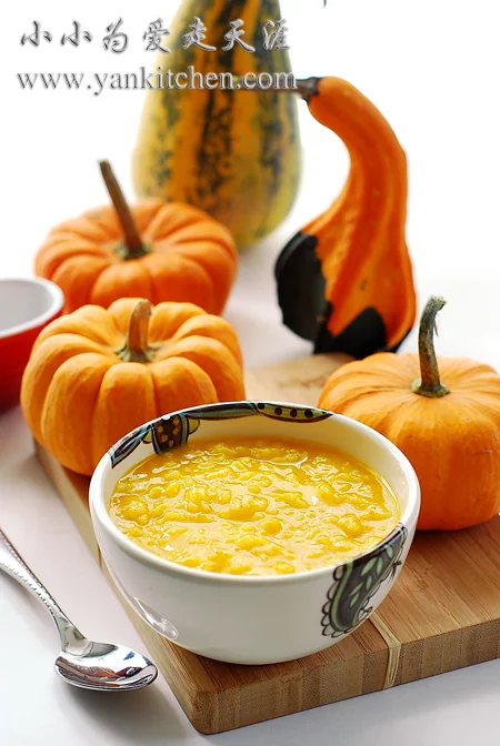 买来的大黄米,除了磨成粉做点心之外,我很爱用它来熬粥,熬出来的粥呈浅浅的米黄色,粥水米交融,浑然一体,加入南瓜泥,颜色变得金灿灿的特别漂亮,在口感味道上也顿时丰富了许多。