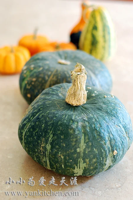 照片上的南瓜,纯属装饰,真正用到的南瓜,是这种绿皮的麻麻的南瓜,不上相,但是很香甜好吃,挑到好的,洗净,蒸熟了才去皮,又甜又粉又面,有时候甚至会有在吃栗子的错觉。用来做点心或者熬粥,也是一流的。