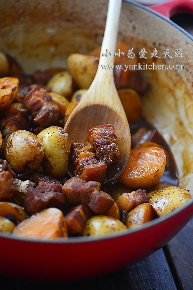 直接做红烧肉就已经很完美了,加点当地农场出产的小土豆下去一起烧,更是锦上添花,小土豆粉粉的面面的,吸足了浓厚的肉汁,一口红烧肉一口土豆,真的是很满足啊。 (不过呢,我们家的规矩,哪天吃红烧肉了的话,是要在跑步机上多跑一个小时的,O(∩_∩)O~ 。。。。)