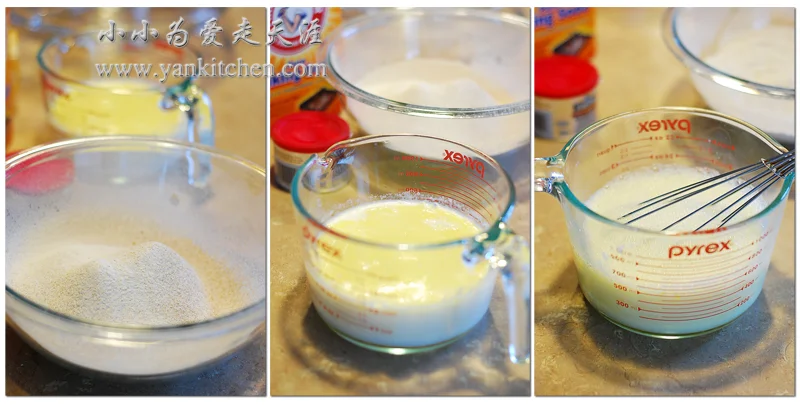 牛奶,黄油和鸡蛋在另外一个碗内打匀。