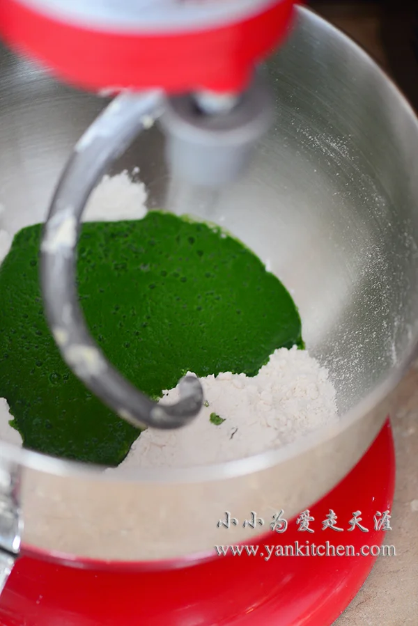 Add flour, salt, spinach mixture and oil to a KitchenAid mixing bowl (from amazon).