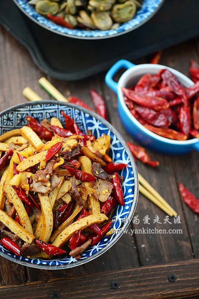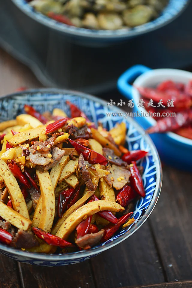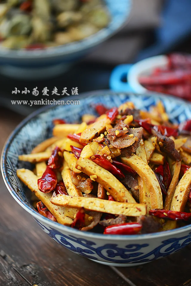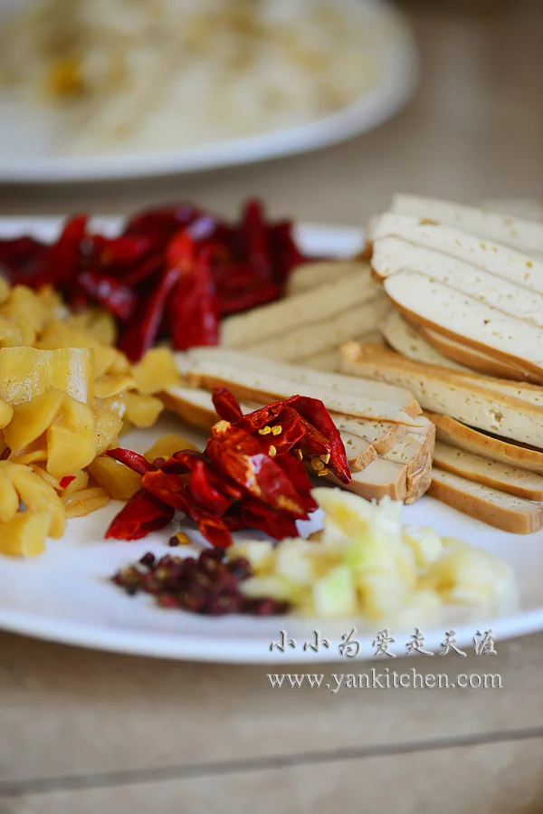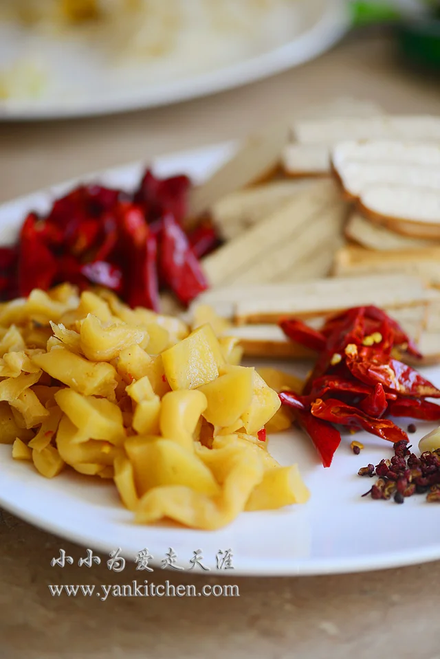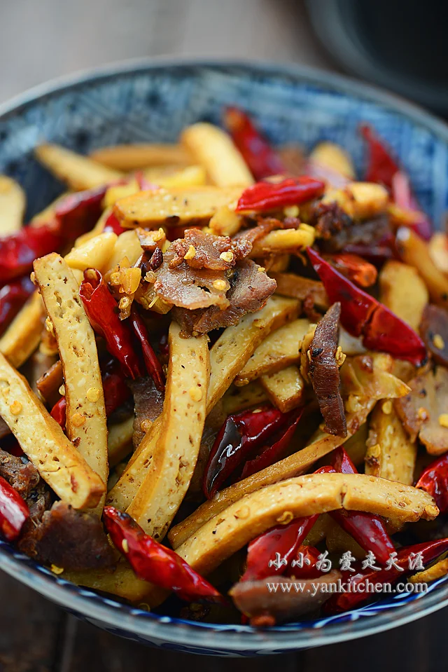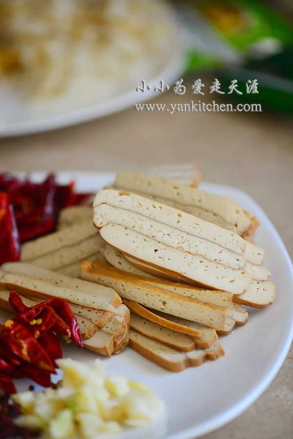 The temperature has been crazily low lately. I gave up my grocery plan and went search in the refrigerator. Found a package of dried tofu and a piece of frozen pork. Good enough to make dinner for two on a Thursday night.