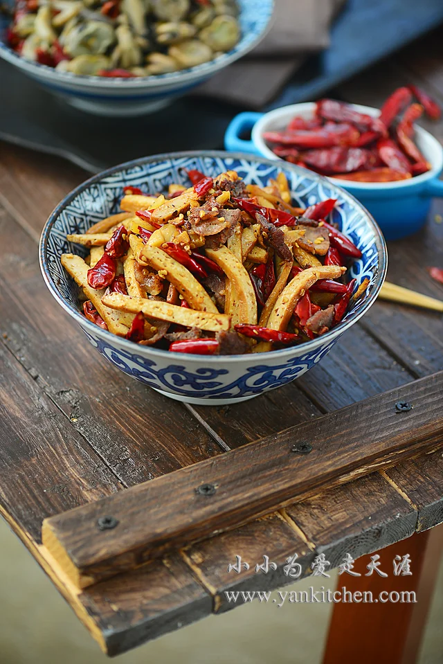Add garlic, Sichuan pepper corns, chili pepper and dried tofu to the wok, and stir fry for a couple minutes. Add dried daikon; stir fry for another couple minutes. Add the cooked pork, along with rice cooking wine, soy sauce, oyster sauce, salt, sugar and black pepper.